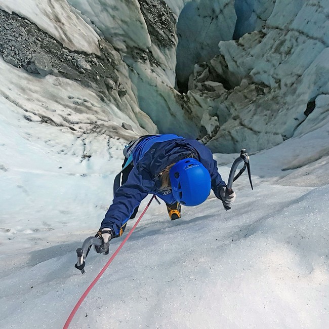 Our expert guides will quickly teach you how to master basic crampon and ice axe techniques. Using ice tools and the front points of your crampons, you climb vertical and at times, overhanging ice walls and pinnacles, or maybe you’ll climb into a crevasse; you are always safely secured by a top rope attached to your harness.